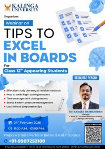 रायपुर। कलिंगा विश्वविद्यालय द्वारा कक्षा 12वीं के उन विद्यार्थियों के लिए, जो इस वर्ष बोर्ड परीक्षा में सम्मिलित होने जा रहे हैं, बोर्ड परीक्षा में उत्कृष्ट प्रदर्शन के टिप्स विषय पर एक राष्ट्रीय वेबिनार का सफल आयोजन किया गया। यह वेबिनार 4 फरवरी 2026 को आयोजित हुआ, जिसमें देशभर से लगभग 500 विद्यार्थियों ने उत्साहपूर्वक भाग लिया।